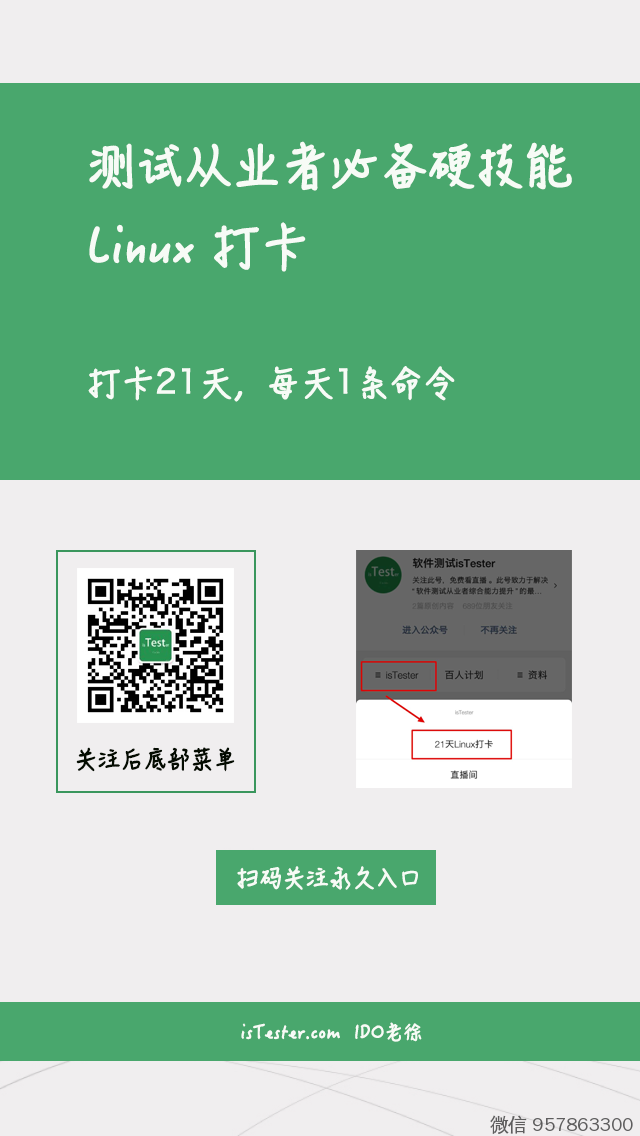 每天,老徐发布一个软件测试从业者用得上的Linux命令作业;跟一群Tester,与老徐一起,每天学习一条Linux命令;