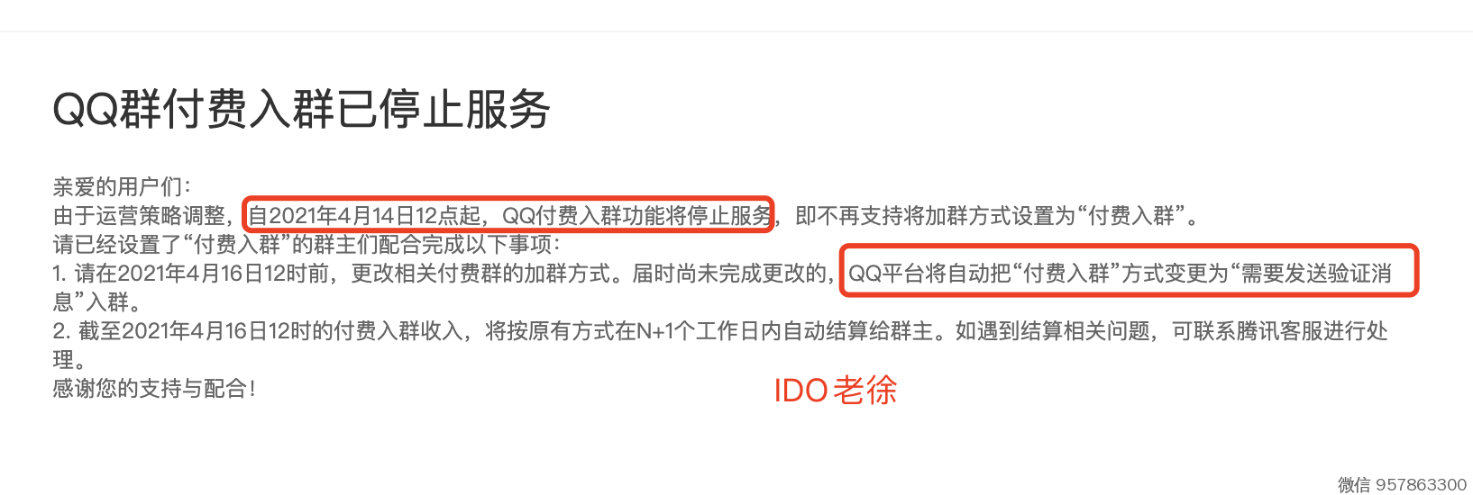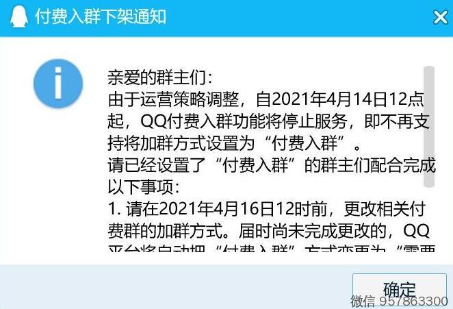 QQ近日通知, 从2021 年4 月14 日12 点起,QQ 付费入群功能全面停止服务,以后所有QQ群聊不在支持“付费入群”