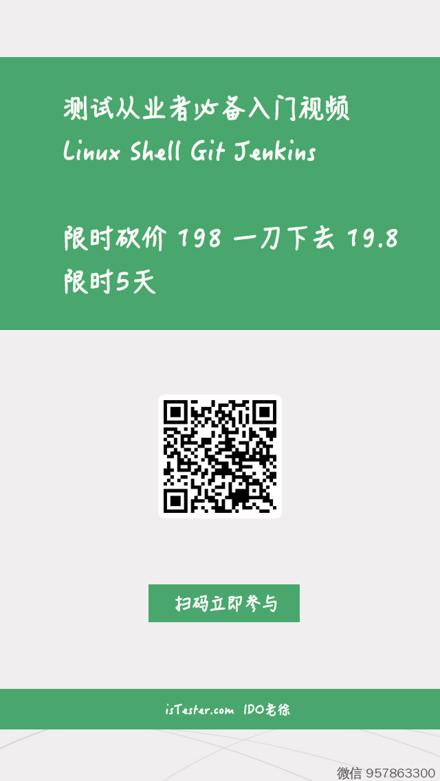 呼应前面的主题,以及这些年,老徐一直主张的观点,唯一打包录制了一个系列的基础入门视频,就是「Linux & Shell & Git & Jenkins系列」(都属于测试从业者必备的硬技能)。
