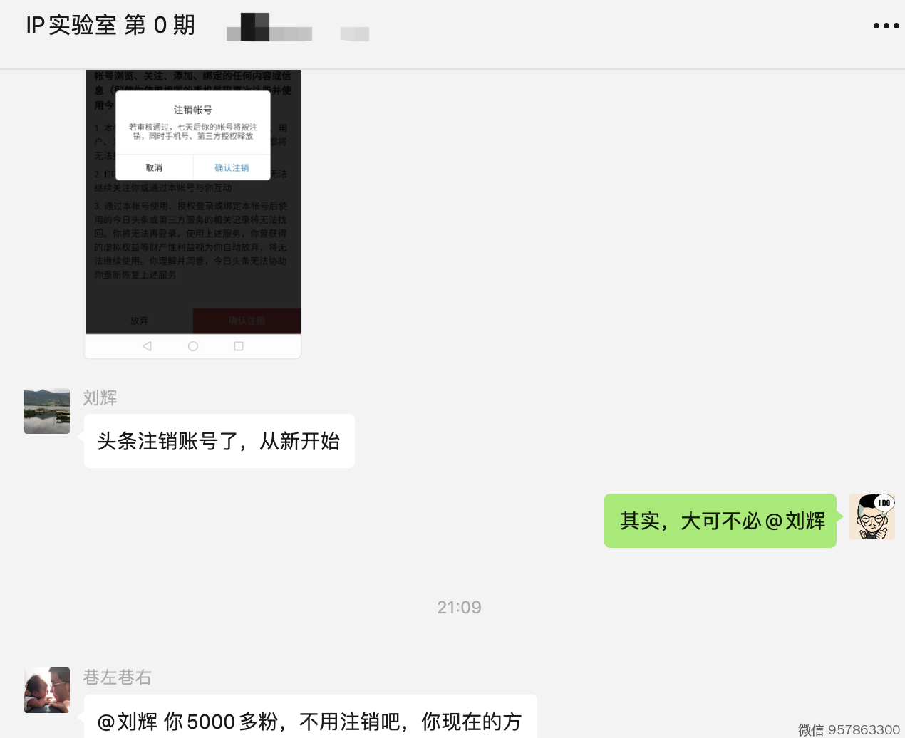 个人IP 实验室 第 0 期群里,有位同学,把 5000粉丝的头条账号注销了 。